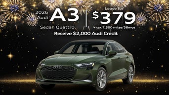 2026 Audi A3 Sedan Quattro: VIN: WAUGUDGY5TA041435 Closed-end financing available through 2/02/2026 for a new, unused 2026 Audi A3 Sedan Quattro with automatic transmission on approved credit to highly qualified customers by Audi Financial Services through participating dealerships. Lease offer only eligible to customers residing in AL, AK, AZ, AR, CA, CO, CT, DE, FL, GA, HI, ID, IL, IN, IA, KS, KY, LA, ME, MD, MA, MI, MN, MS, MO, MT, NE, NV, NH, NJ, NM, NY, NC, ND, OH, OK, OR, PA, RI, SC, SD, TN, TX, UT, VT, VA, WA, WV, WI, WY. Monthly lease payment based on MSRP of $43,710 and destination charges, less a suggested dealer contribution resulting in a capitalized cost of $41,000 Excludes tax, title, license, options, and dealer fees. No security deposit required. Due at signing amount of $7,858 includes down payment of $4,371 and inceptions. All tax, title, government fees, acquisition fees, bank fees, vehicle registration fees and $1195 dealer doc fee are additional Your payment will vary based on final negotiated price. At lease end, lessee is responsible for disposition fee of $499, 0.25/mile in excess of 7500 miles and excessive wear and use. Offer not valid in Puerto Rico. See your Audi dealer for details or, for general product information, call 1-800-FOR-AUDI. © 2024 Audi of America, Inc. Using Special rates with no Audi credit rebates. Customer bonus applied toward MSRP and is not redeemable for cash. Offer not valid in Puerto Rico. See dealer for details. *Audi of America will pay a $2,000 customer bonus when you purchase or lease a new, unused 2026 Audi A3 Sedan 40 TFSI quattro through participating dealers. Offer ends 02/02/2026. Customer bonus applied toward purchase or lease and is not redeemablefor cash. Offer not valid in Puerto Rico. See your local Audi dealer or, for general product information, call 1-800-FOR-AUDI. © 2026 Audi of America, Inc.