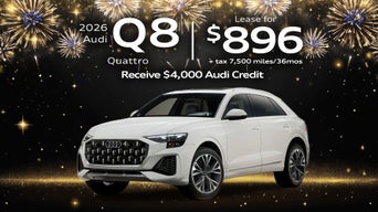 2026 Audi Q8 Quattro: VIN: WA1BVBF1XTD013013 Closed-end financing available through 2/02/2026 for a new, unused 2026 Audi Q8 Quattro with AUTOMATIC transmission on approved credit to highly qualified customers by Audi Financial Services through participating dealerships. Lease offer only eligible to customers residing in AL, AK, AZ, AR, CA, CO, CT, DE, FL, GA, HI, ID, IL, IN, IA, KS, KY, LA, ME, MD, MA, MI, MN, MS, MO, MT, NE, NV, NH, NJ, NM, NY, NC, ND, OH, OK, OR, PA, RI, SC, SD, TN, TX, UT, VT, VA, WA, WV, WI, WY. Monthly lease payment based on MSRP of $83,650 and destination charges, less a suggested dealer contribution resulting in a capitalized cost of $79,000 Excludes tax, title, license, options, and dealer fees. No security deposit required. Due at signing amount of $11,852 includes down payment of $8,365 and inceptions. All tax, title, government fees, acquisition fees, bank fees, vehicle registration fees and $1195 dealer doc fee are additional Your payment will vary based on final negotiated price. At lease end, lessee is responsible for disposition fee of $499, 0.25/mile in excess of 7500 miles and excessive wear and use. Offer not valid in Puerto Rico. See your Audi dealer for details or, for general product information, call 1-800-FOR-AUDI. © 2024 Audi of America, Inc. Using Special rates with no Audi credit rebates. Customer bonus applied toward MSRP and is not redeemable for cash. Offer not valid in Puerto Rico. See dealer for details *Audi of America will pay a $4,000 customer bonus when you purchase or lease a new, unused 2025 Audi Q8 55 TFSI quattro through participating dealers. Offer ends 02/02/2026. Customer bonus applied toward purchase or lease and is not redeemable for cash. Offer not valid in Puerto Rico. See your local Audi dealer or, for general product information, call 1-800-FOR-AUDI. © 2026 Audi of America, Inc.